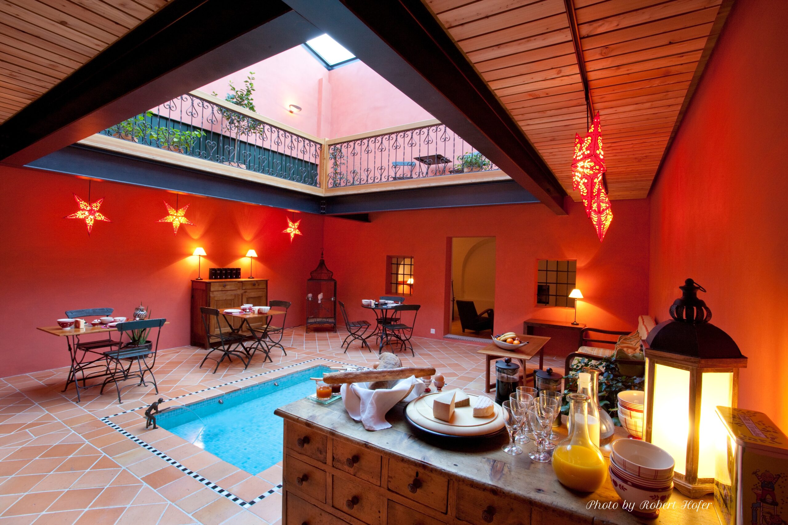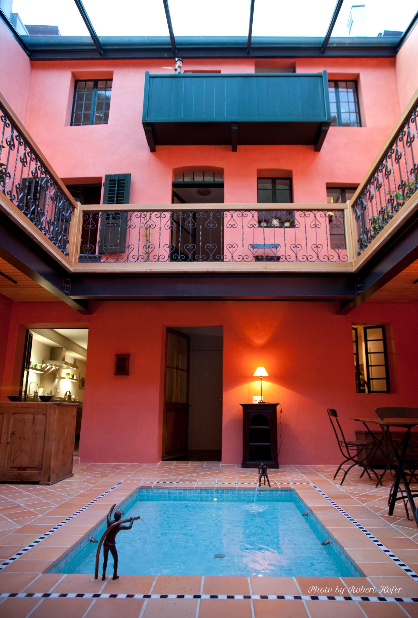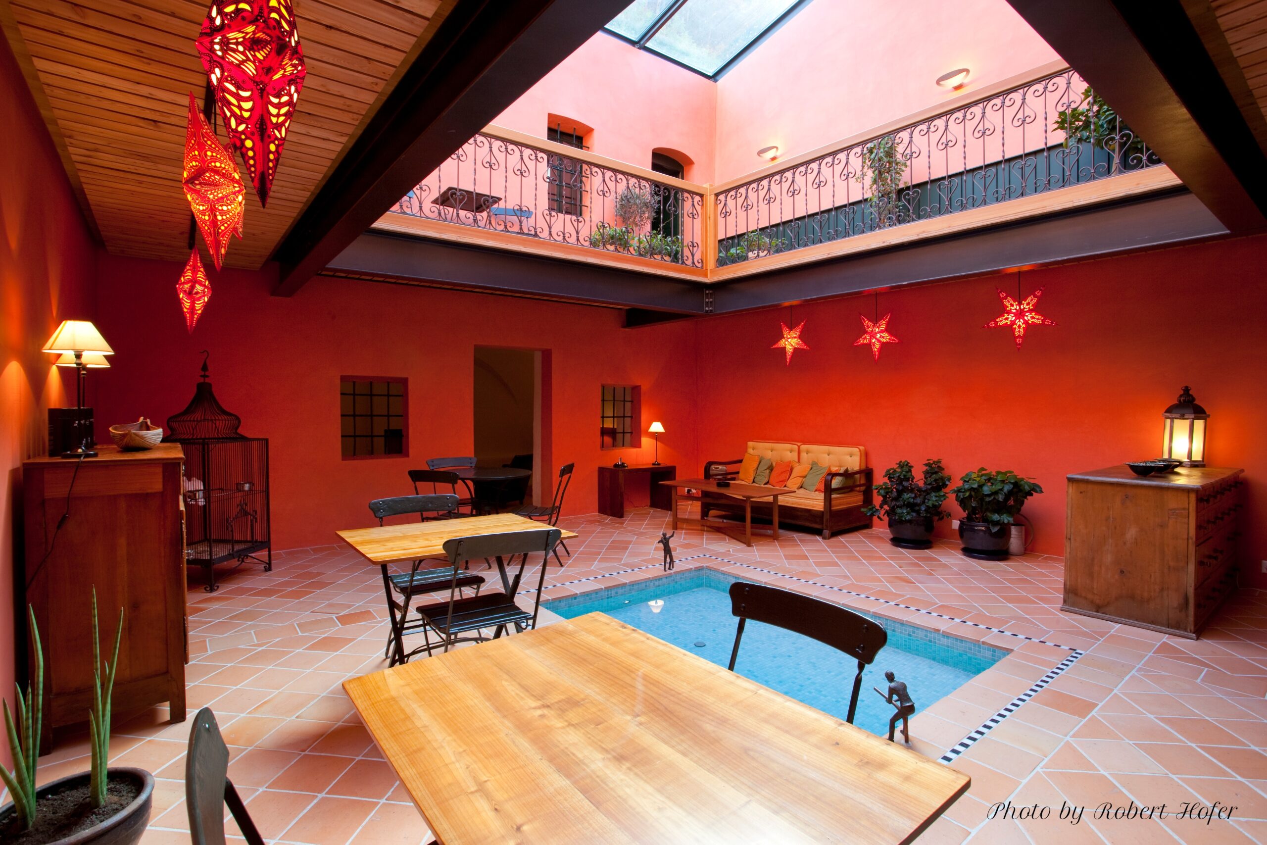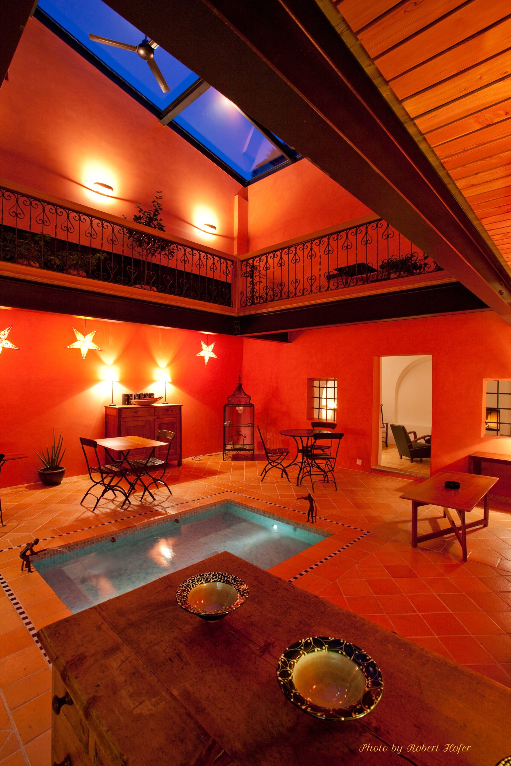 Véritable cœur de la maison où vous pourrez vous y détendre au bord du petit bassin de délassement, lire un livre ou simplement profiter de la lumière, quelle que soit la météo.
