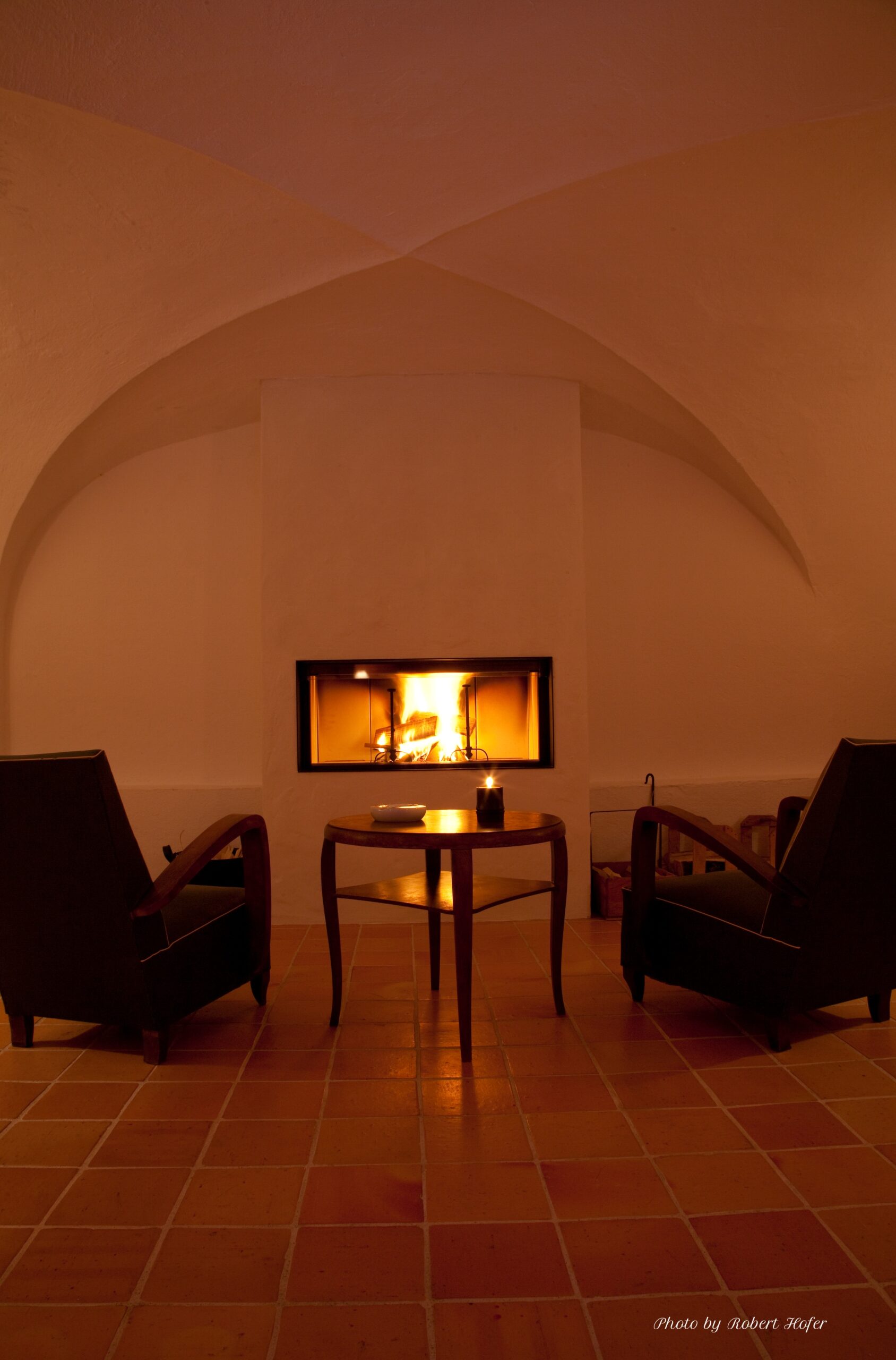 Pour les soirées plus fraîches, profitez de notre salon voûté. Installez-vous confortablement dans les fauteuils face au crépitement du feu pour un moment de lecture ou de discussion privilégié